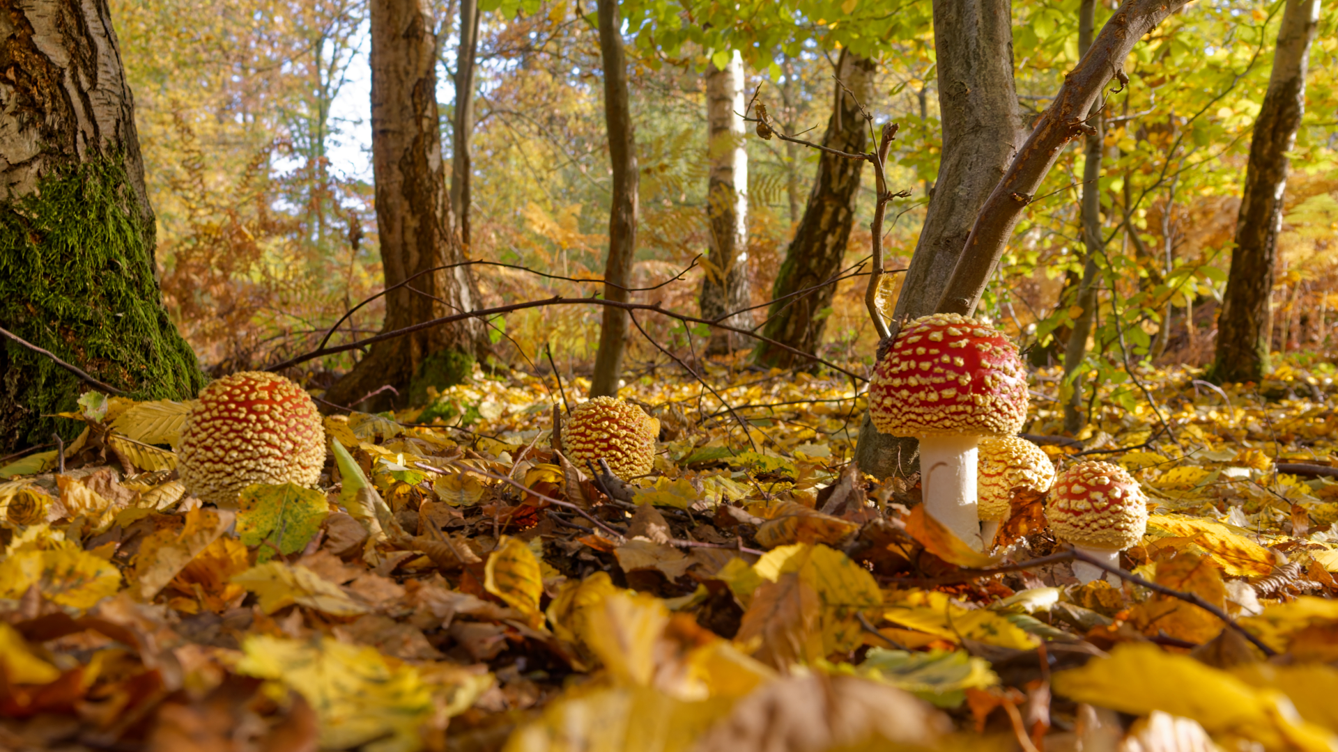 Les rouges éclatants et leurs points clairs contrastent magnifiquement avec les tons chauds de la forêt, tandis que la perspective basse donne l’impression d’entrer dans un mini-monde secret… calme, lumineux, et typiquement automnal.