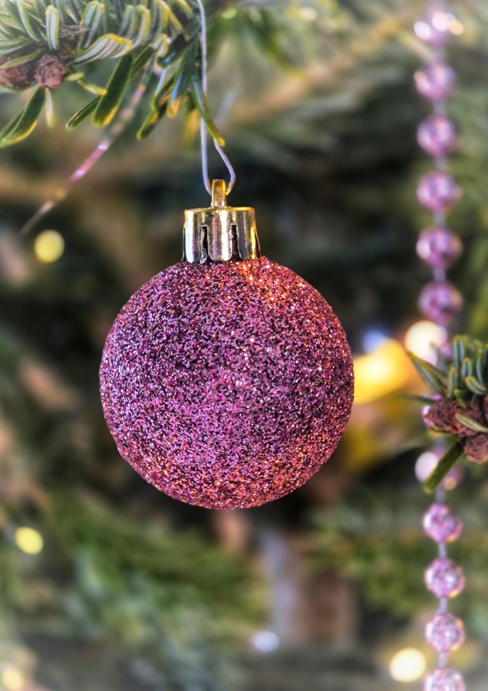 Son image met en scène une boule de Noël rose scintillante, suspendue dans le sapin, isolée par une profonde faible profondeur de champ. Le fond se transforme en un joli bokeh de lumières et de verts doux, qui met parfaitement en valeur la texture pailletée de la décoration.